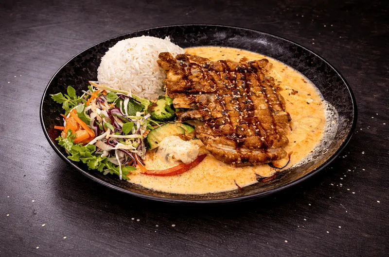 Cremige Kokos-Curry-Sauce mit frischem Gemüse, serviert mit knackigem Salat, Reis und …