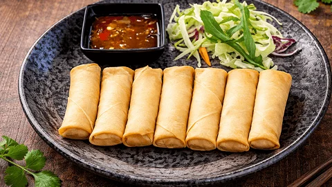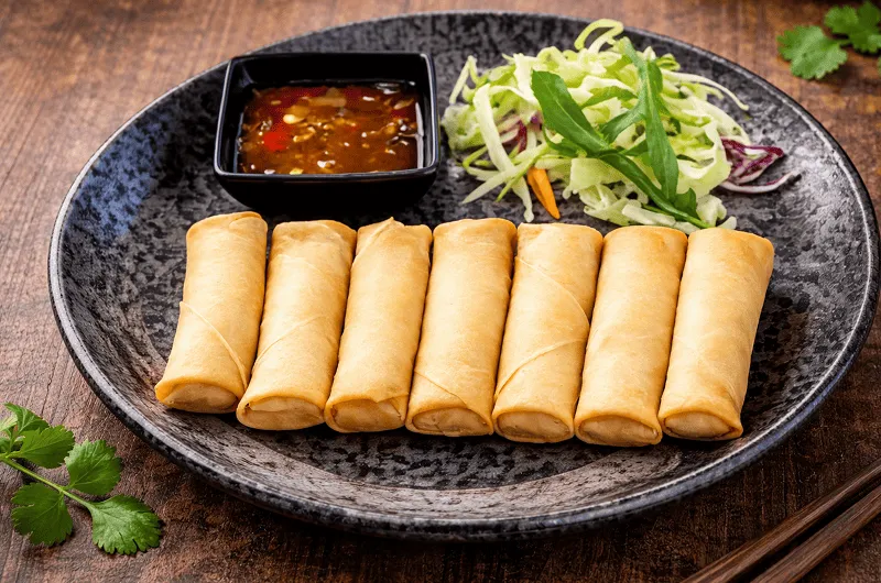 (8 Stk.) Vegetarische Mini-Frühlingsrollen, serviert mit Süß-Sauer-Soße