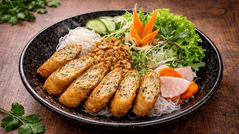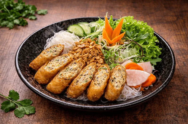 Frittierte Frühlingsrollen mit Gemüse und Glasnudeln, serviert mit süß-saurer Soße, mit Hühnerfleisch